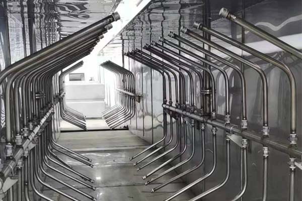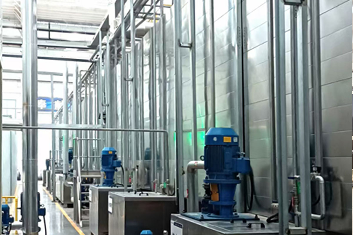 前處理生產(chǎn)線結(jié)構(gòu)特點(diǎn)是:前處理生產(chǎn)線各工序噴淋管布置在隧道內(nèi),噴淋由各液槽的泵來提供.各工序間都有門洞板隔開,以防竄液.各加熱液槽的加熱形式有槽內(nèi)和槽外。內(nèi)加熱器有排管、蛇形管、波紋板等;外加熱器有列管、板式加熱器等。加熱介質(zhì)有熱水 、蒸汽、導(dǎo)熱油等。在脫脂、磷化工序分別設(shè)有除油系統(tǒng)和除渣系統(tǒng)。為防止各加熱段隧道頂部及門洞處溢出蒸汽,在隧道頂部設(shè)有排風(fēng)機(jī)。